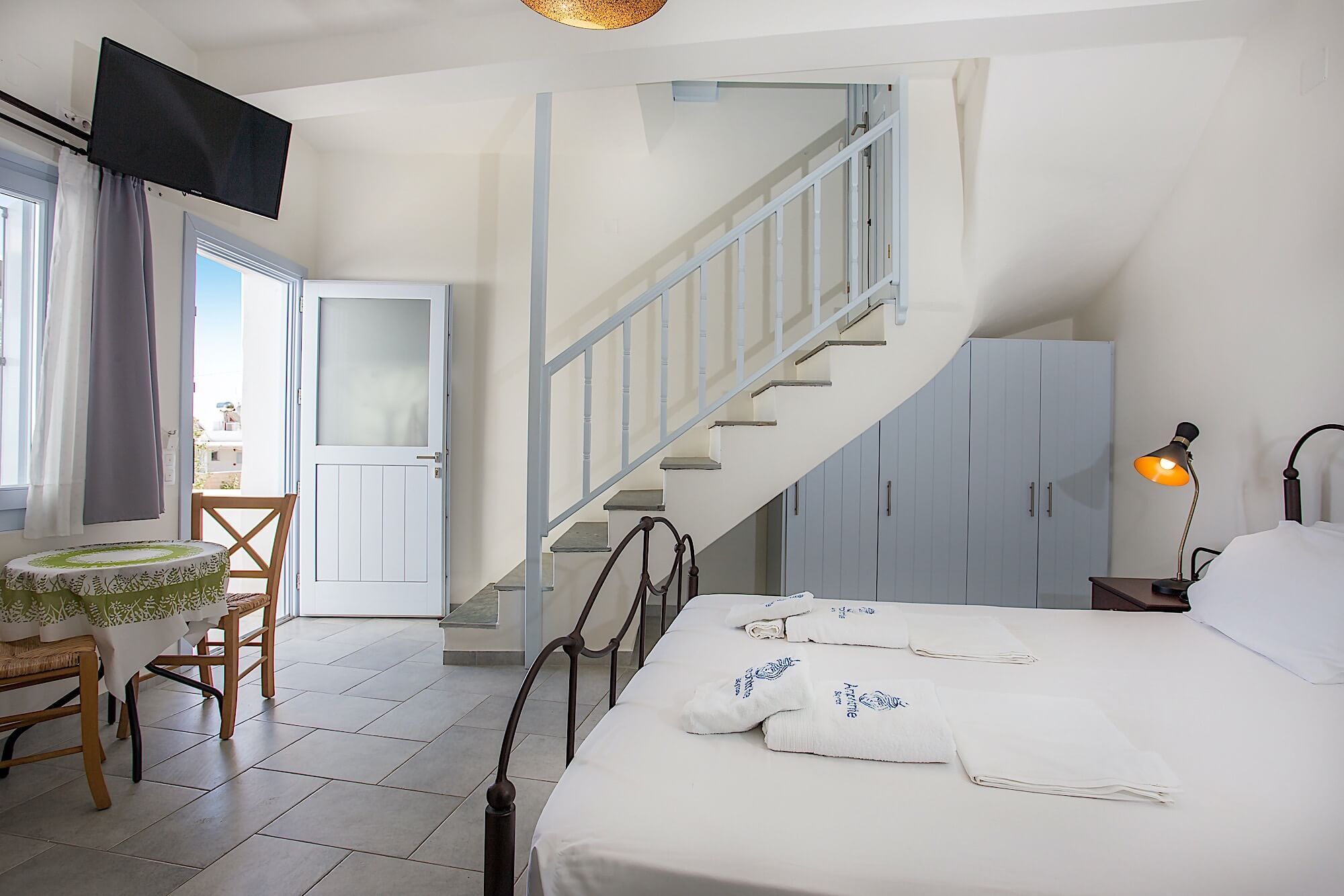 Στο πάνω ισόγειο υπάρχει καθιστικό με τραπεζαρία, καναπές που γίνεται ένα διπλό ή 2 μονά κρεβάτια, flat τηλεόραση, ενεργειακό τζάκι, air condition, πλήρως εξοπλισμένη κουζίνα με ηλεκτρικές συσκευές (κουζίνα, φούρνος, ψυγείο, μηχανή Nespresso, καφετιέρα γαλλικού, ηλεκτρικό μπρίκι ελληνικού, βραστηρα, φραπεδιέρα, τοστιέρα) και όλα τα απαραίτητα κουζινικά , μπάνιο με ντουζιέρα.