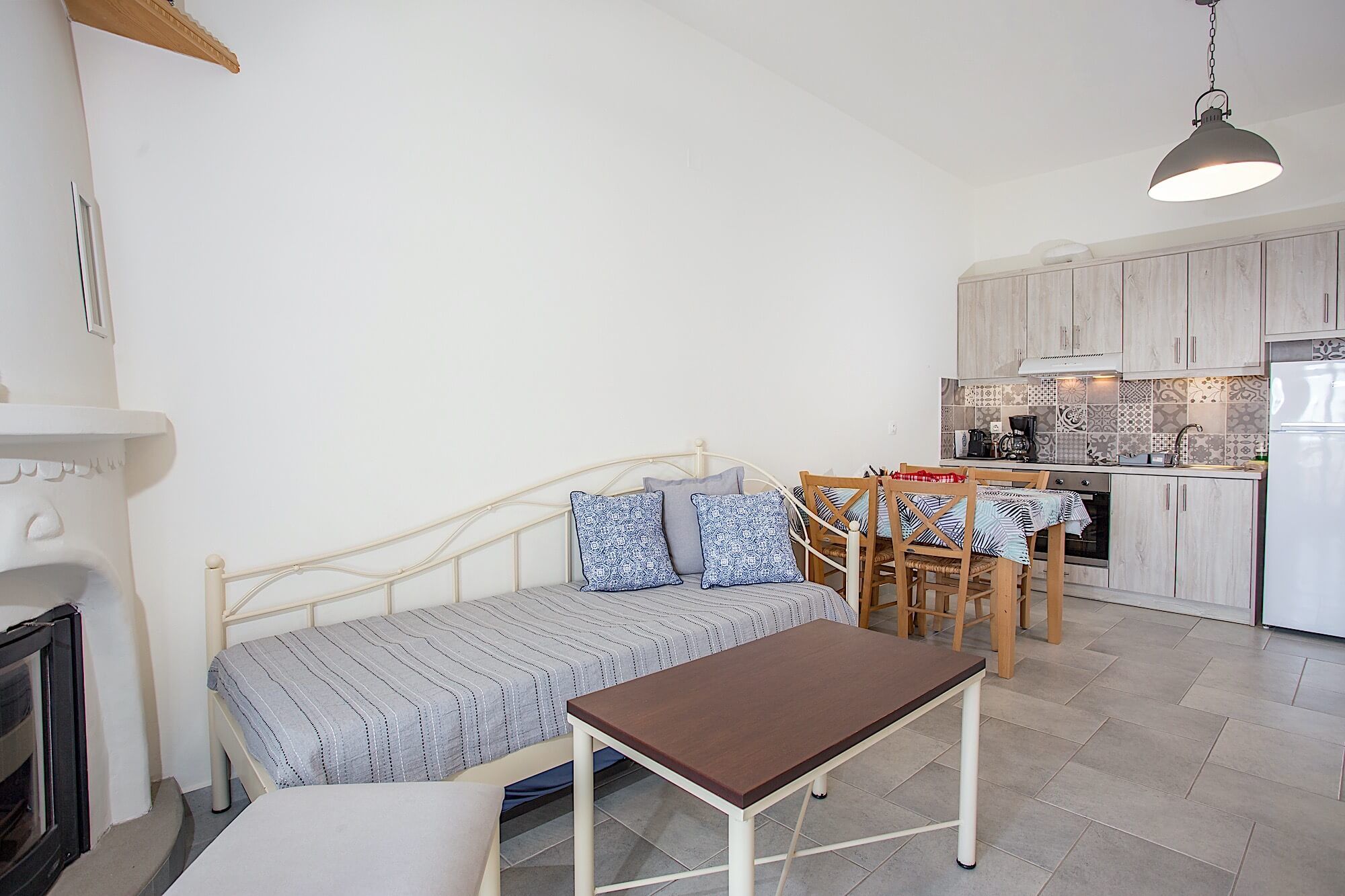 Στο πάνω ισόγειο υπάρχει καθιστικό με τραπεζαρία, καναπές που γίνεται ένα διπλό ή 2 μονά κρεβάτια, flat τηλεόραση, ενεργειακό τζάκι, air condition, πλήρως εξοπλισμένη κουζίνα με ηλεκτρικές συσκευές (κουζίνα, φούρνος, ψυγείο, μηχανή Nespresso, καφετιέρα γαλλικού, ηλεκτρικό μπρίκι ελληνικού, βραστηρα, φραπεδιέρα, τοστιέρα) και όλα τα απαραίτητα κουζινικά, μπάνιο με ντουζιέρα.