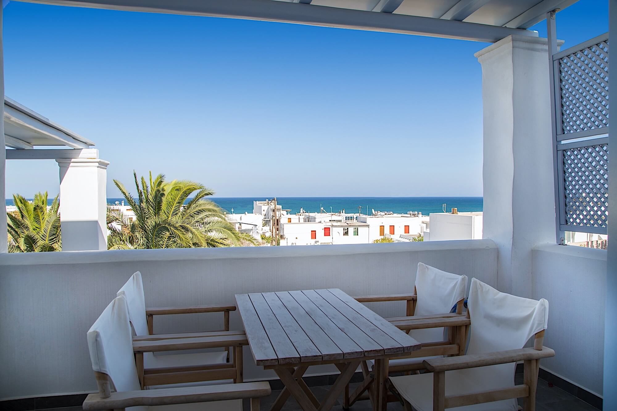 Βεράντα με έπιπλα εξωτερικού χώρου και θέα στην θάλασσα και στην πισίνα.